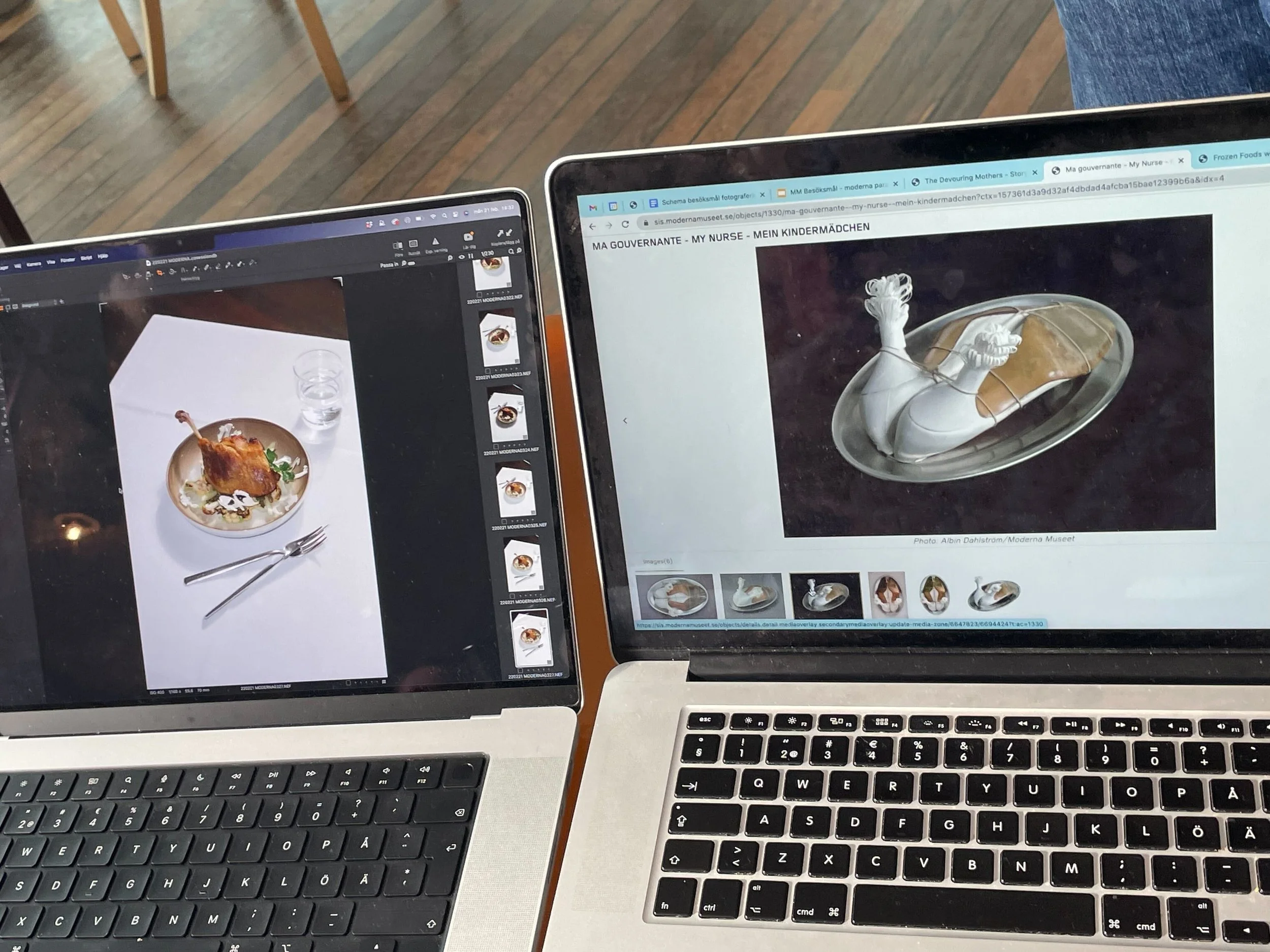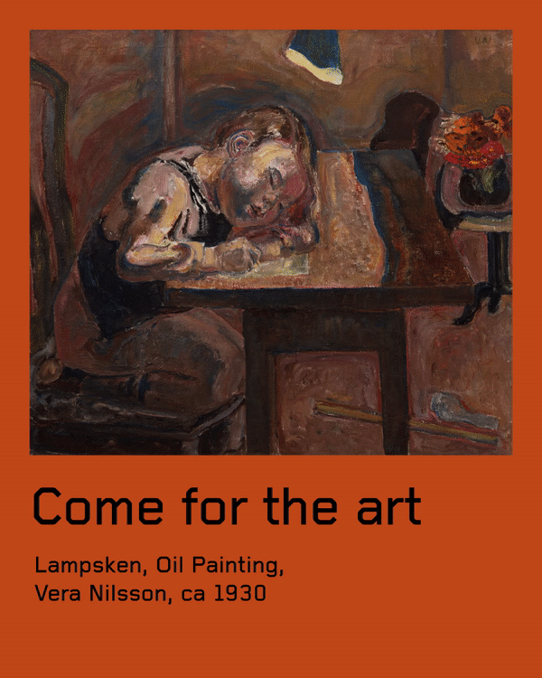 Min idé är enkel, konst som liknar verkligheten. Vi kombinerade konst från samlingen med nya foton av museiupplevelsen. Dorothéa Tannings skulptur ser ut som en kopp kaffe, Vera Nilsons målning Lampsken ser ut som ett barn som målar i Modernas verkstad.